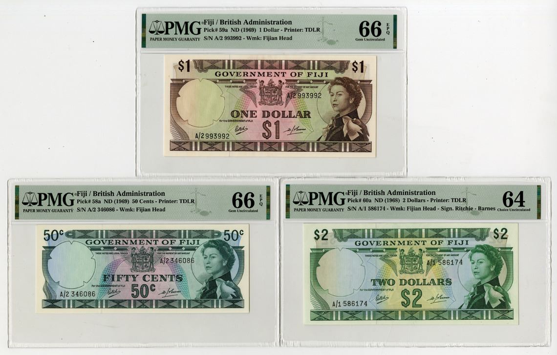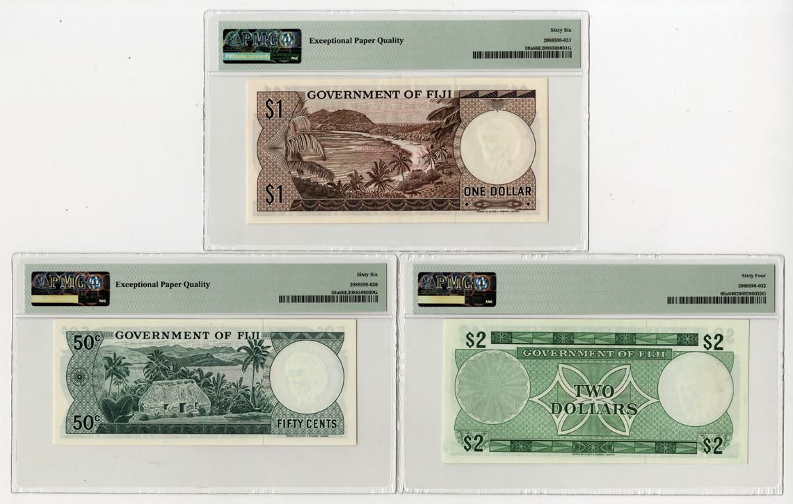 Fiji, ND (1968-699). Lot of 3 Issued Banknotes, Includes: 50 Cents, P-58a, ND (1969), S/N A/2 346086, PMG Gem UNC 66 EPQ, TDLR; 1 Dollar, P-59a, ND (1969), S/N A/2 993992, PMG Gem UNC 66 EPQ, TDLR; and, 2 Dollars, P-60a, ND (1968), S/N A/1 586174, PMG Choice UNC 64, TDLR. (3). Sold "AS IS" no returns accepted.