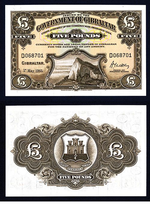 Gibraltar, 1st May 1965, 5 Pounds, P-19b, Issued banknote, Brown on m/c, Rock of Gibraltar in middle, back brown with arms, S/N D068701, Choice AU condition with sharp corners, bright colors and large margins. TDLR.
