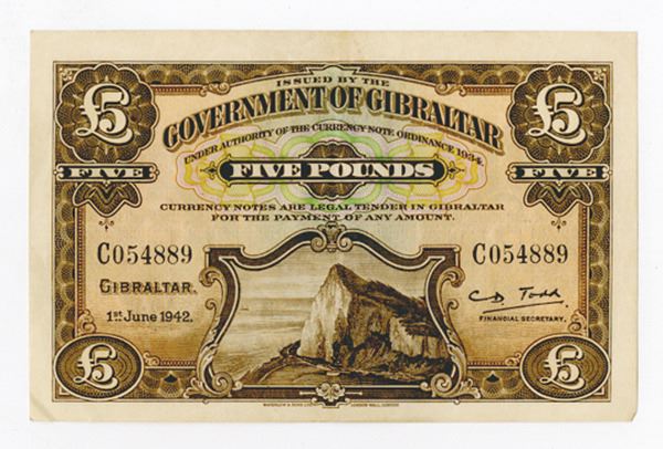 Gibraltar... 1.6.1942, £5, P-16a, Issued banknote, Brown on m/c, Rock of Gibraltar at bottom middle, back brown with arms, S/N C059289, Crisp Choice VF. Sharp corners, bright colors, deep embossing, excellent centering with jumbo margins and fresh appearance enhance this totally original note from a new find. W&S.
