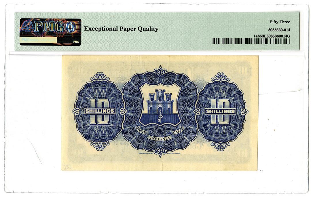 Gibraltar/British Administration. 1942. 10/- Shillings, P-14b, Issued banknote, Blue and yellow on face, S/N C607345, Watermark: Keys - Without Sec. Thread, PMG graded About Uncirculated 53 EPQ. Printer: W&S.