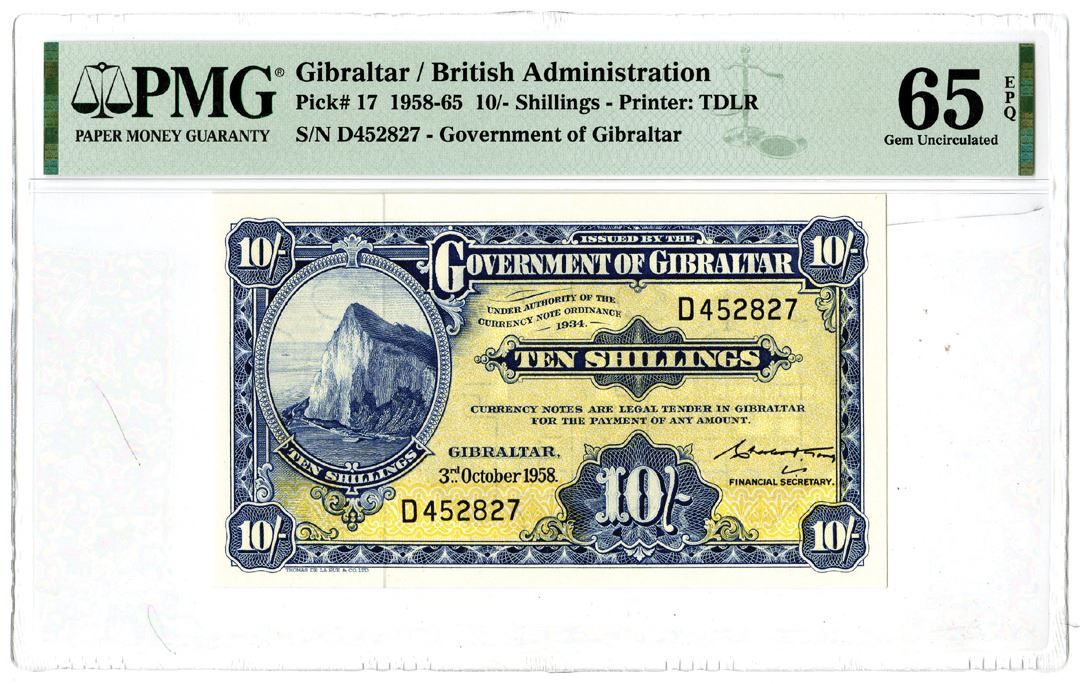 Gibraltar/British Administration. 1958-65. 10/- Shillings, P-17, Issued banknote, Blue and yellow, S/N D452827, PMG graded Gem Uncirculated 65 EPQ. Printer: TDLR.
