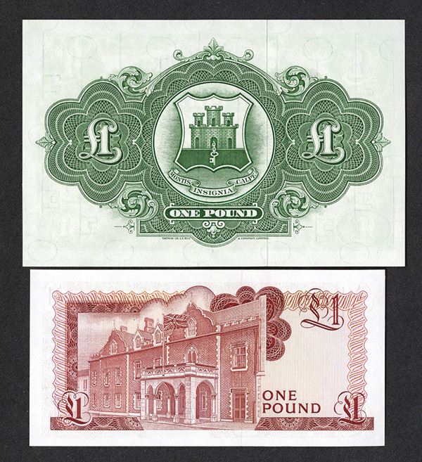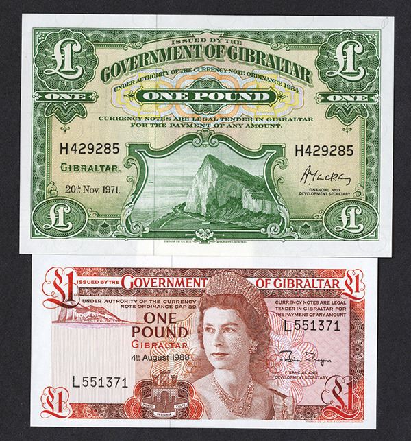Gibraltar. 1 Pound. P-18b 20.11.1971; 20e 4.8.1988. Rock of Gibraltar on first and Elizabeth II on second. Both Choice to Gem Uncirculated with bold embossing.