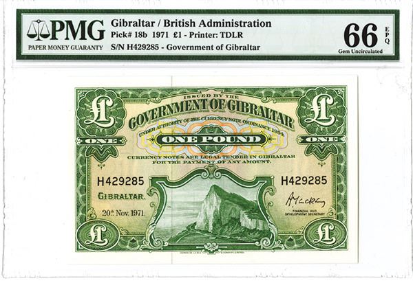 Gibraltar, £1, P-18b, Issued, Green on m/c, PMG graded Gem Uncirculated 66 EPQ.