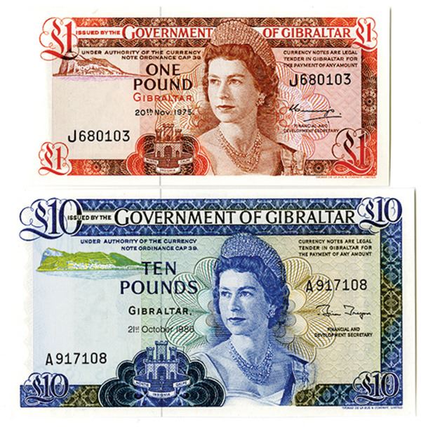 Gibraltar, Lot of 2 notes, Includes 1975, £1 Pound, P-20a, Uncirculated to CU condition or better; and 1986, £10, P-22b, Unc to CU. Both with Queen Elizabeth. (2).