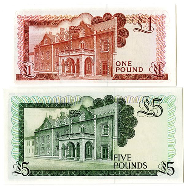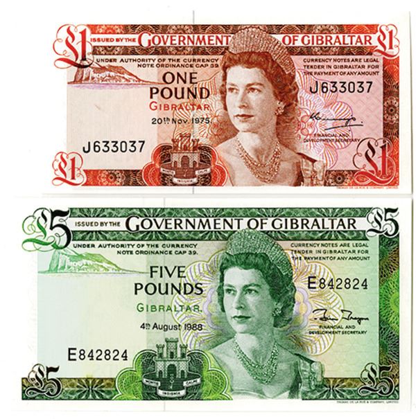 Gibraltar, Lot of 2 notes, Includes 1975, £1 Pound, P-20a, CU; and 1988, £5, P-21b, Unc to CU. Both with Queen Elizabeth. (2).