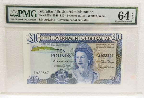 Gibraltar, £10, p-22b, Issued banknote, Blue on m/c, Queen Elizabeth II at right center, back blue, S/N A922347, PMG graded Choice Uncirculated 64 EPQ.