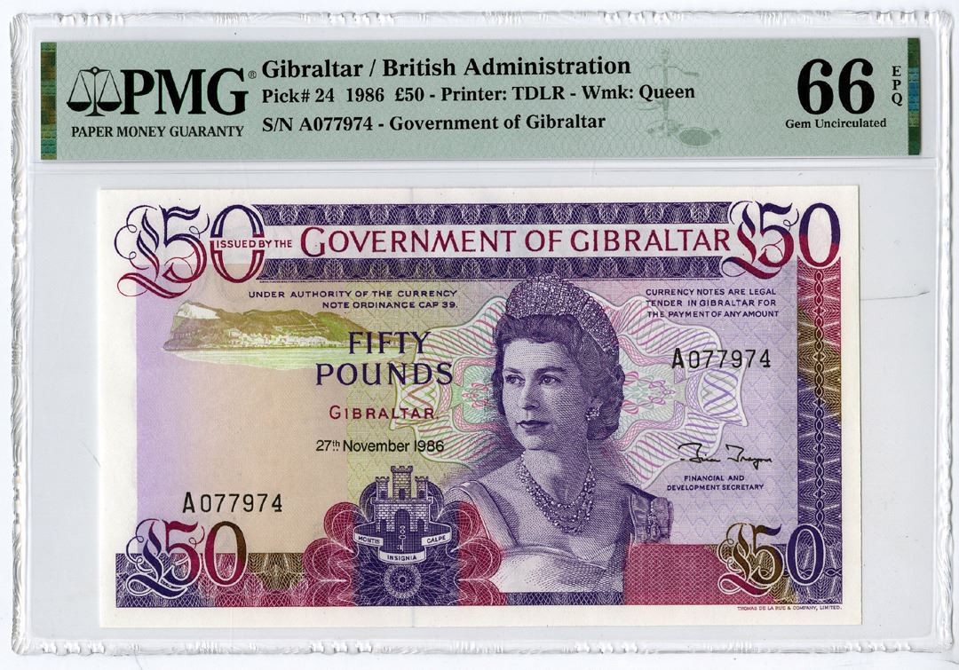 Gibraltar, 1986. £50 Pounds, P-24, Issued Banknote. Purple on m/c with portrait of Queen Elizabeth II at right. S/N A077974. PMG graded Gem Uncirculated 66 EPQ.