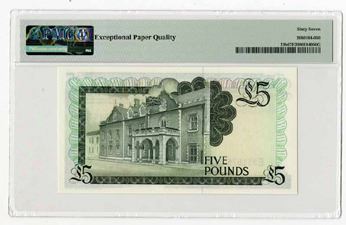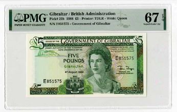 Gibraltar. 1988. £5 Pounds, P-21b, issued banknote, Queen Elizabeth at right, S/N E851575, PMG Graded Superb Gem Unc 67 EPQ, TDLR.