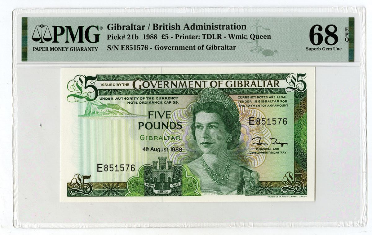Gibraltar. 1988. £5 Pounds, P-21b, issued banknote, Queen Elizabeth at right, S/N E851576, PMG Graded Superb Gem Unc 68 EPQ, TDLR. Only 4 notes grade higher out of 458 graded in the PMG census.