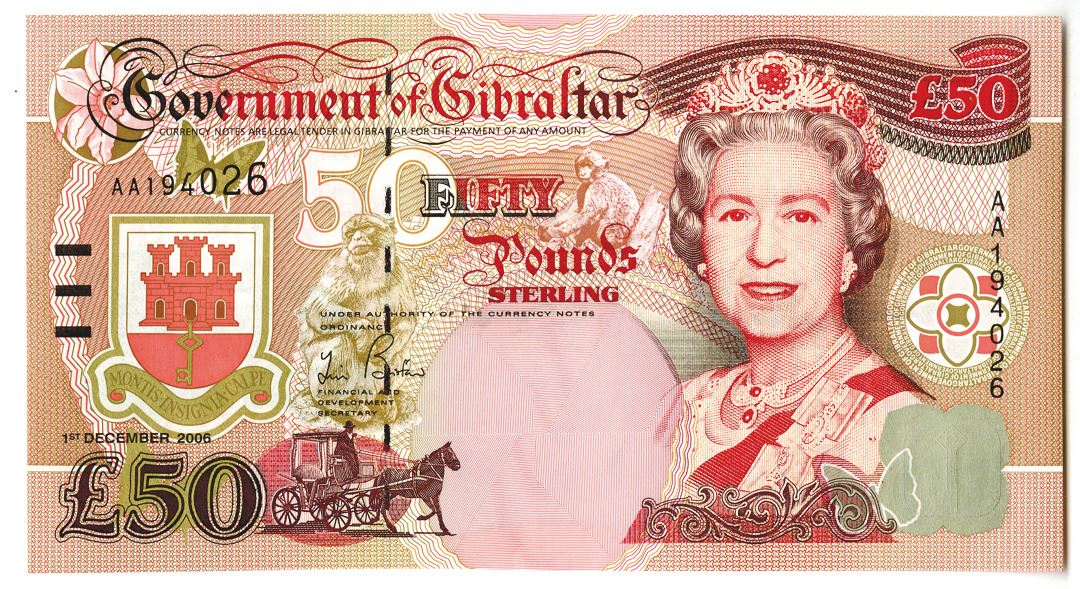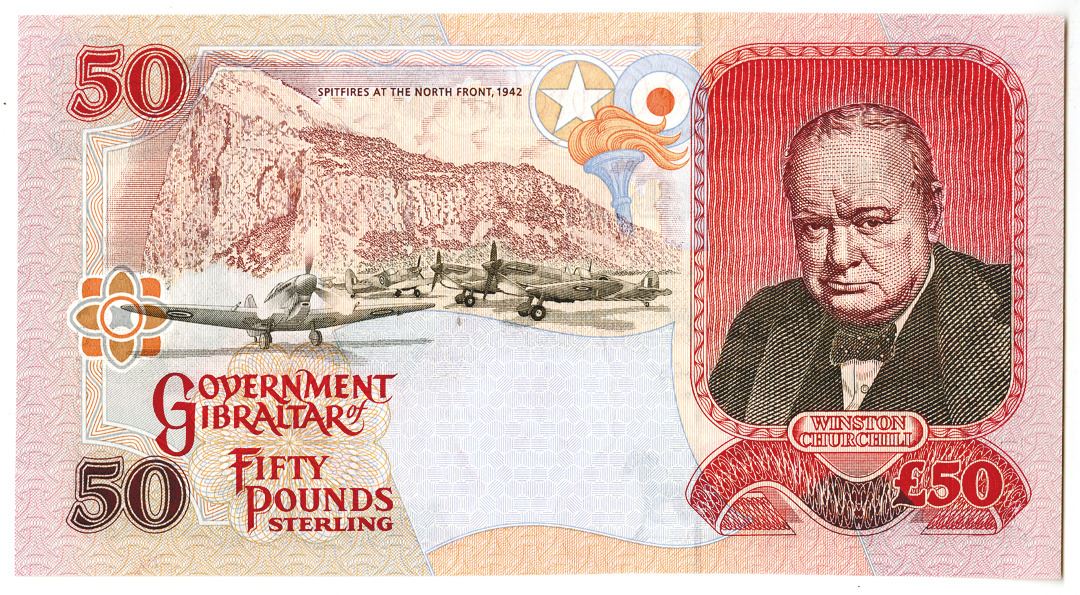 Gibraltar/British AdministrationÉ Government of Gibraltar, 50 Pound, 2006, P-34a, Red and violet on m/c underprint, mature image of Queen Elizabeth II at right, back shows Winston Churchill at right, Spitfire airplanes at the North Front, reprint of P-28a with new date and signature. Choice AU-Unc condition.