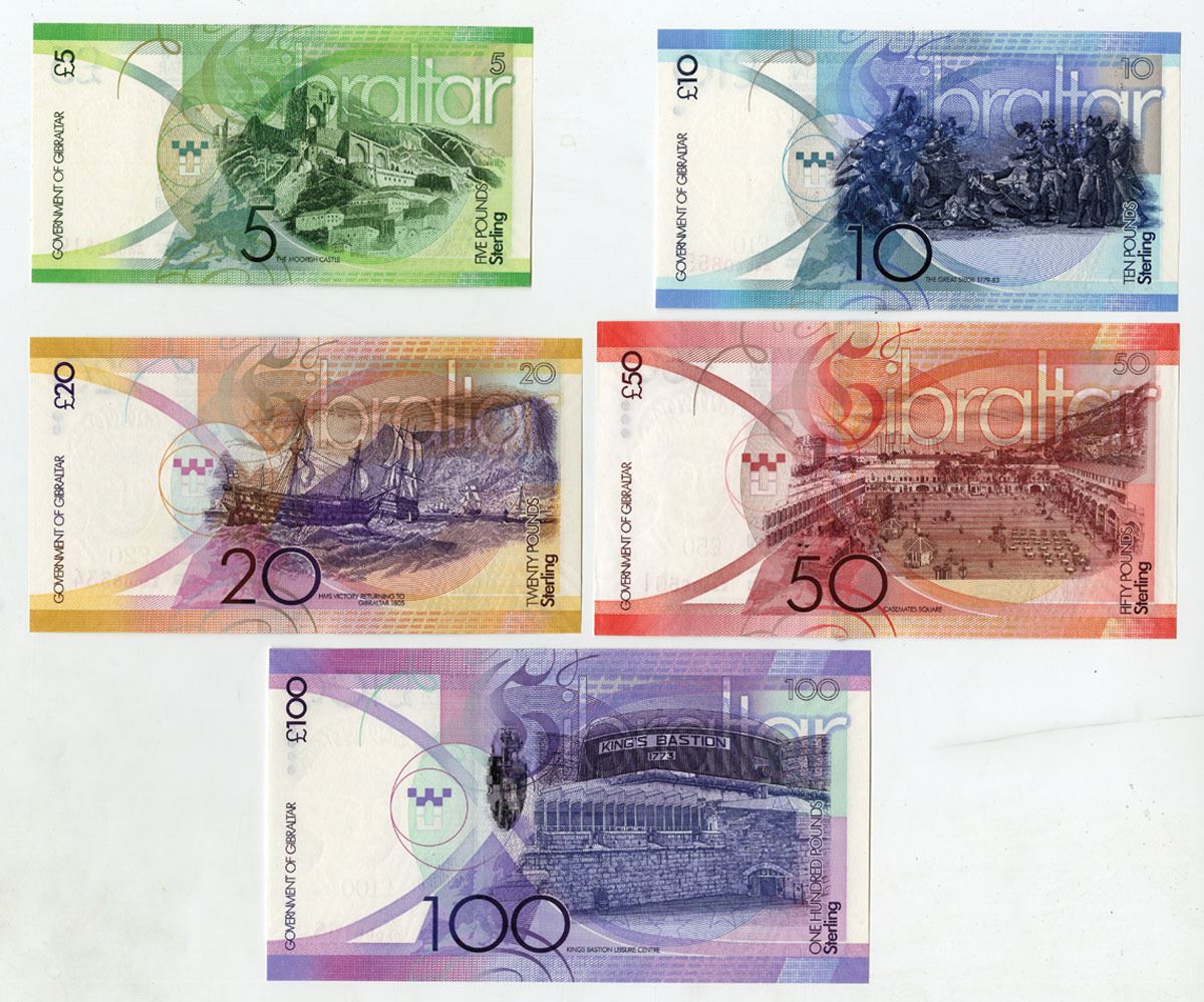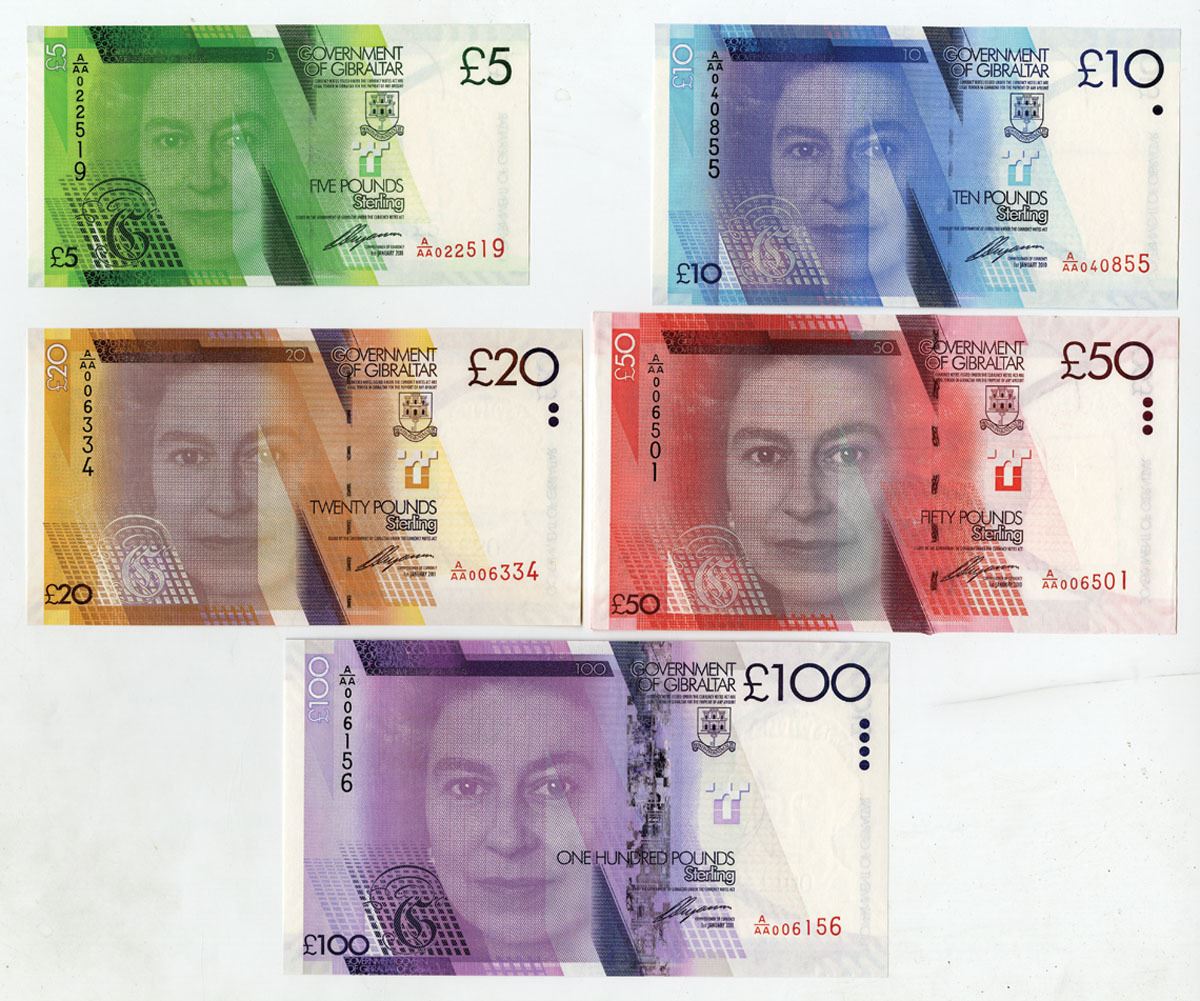 Gibraltar, 2010-11. Lot of 5 Issued Banknotes, Includes: 5 Pounds, P-35, 2011; 10 Pounds, P-36, 2010; 20 Pounds, P-37, 2011; 50 Pounds, P-38, 2010; and, 100 Pounds, P-39, 2011. Notes are AU to Unc condition and printed by TDLR. (5). Sold "AS IS" no returns accepted.