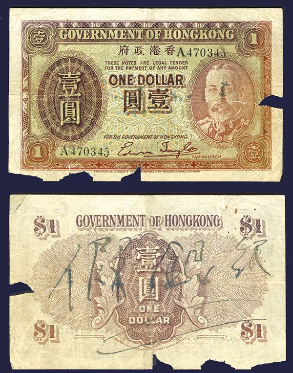 $1, P-311, Counterfeit in brown instead of issued purple, possibly due to the low quality inks used by the counterfeiters, King George V on right, back brown, Also included is a small piece of paper from the ABN file this note was taken from listing the date it was sent to ABN (1938) with note that it was retained by Schomp (1939), It would have graded Fine to VF but the brittle paper is chipping and the note could easily fall apart if not handled carefully. Rare Archival Research Sample by American Bank Note Company. The note is printed by BWC, but the counterfeit was acquired for the ABN Research department.