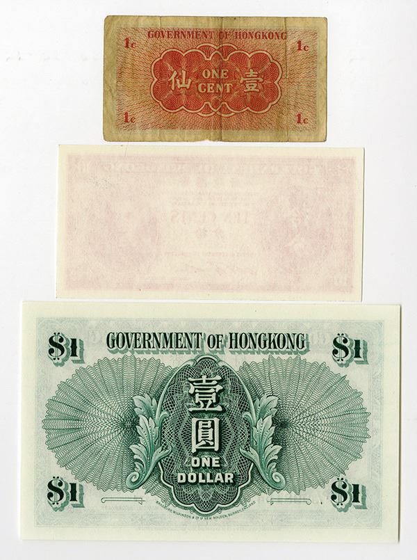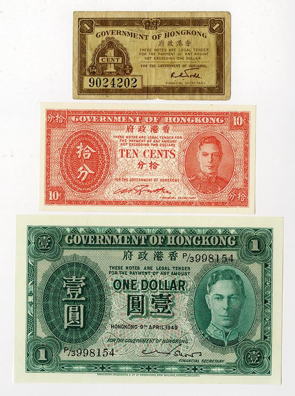 Hong Kong, lot includes 1 Cent, ND (1941), P-313, Fine; 10 Cents, ND (1945), P-323, uniface, Uncirculated; and 1 Dollar, 1949, P-324a, Uncirculated, BWC.