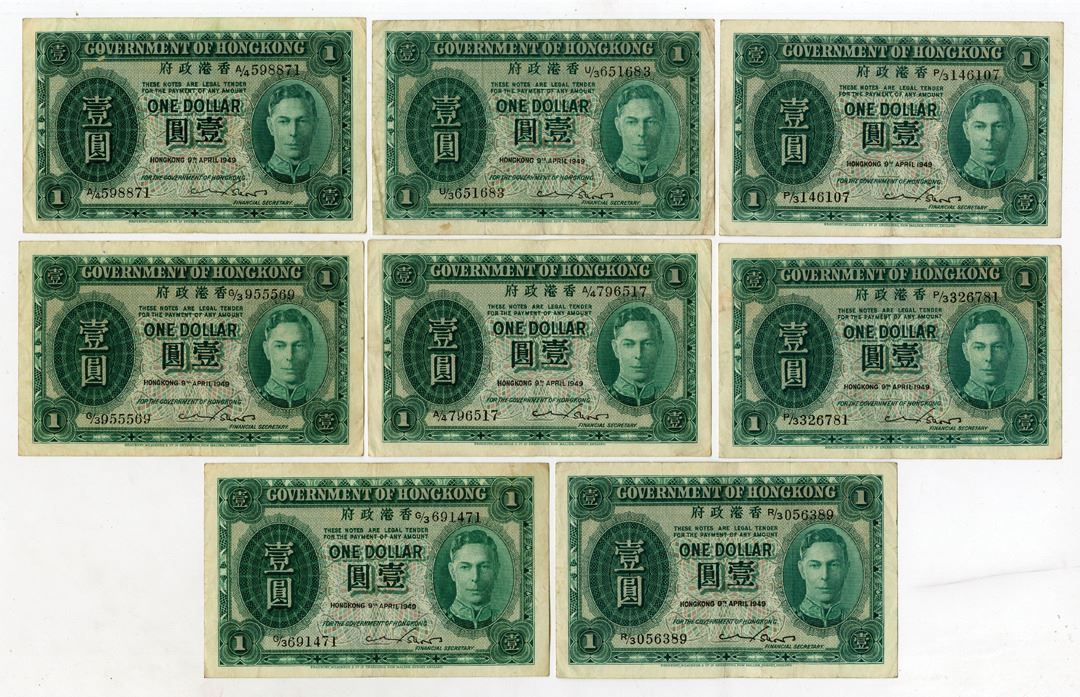 Hong Kong, 1948. $1, P-324a (8), Lot of 8 Issued Banknotes, Green on m/c underprint with portrait of King George VI at right, Printer: BWC, Notes are Fine to Choice VF condition. (8). Sold "AS IS" no returns accepted.