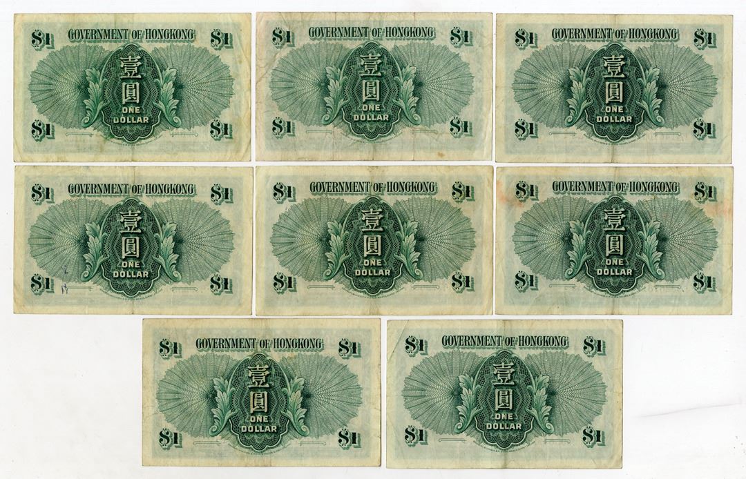 Hong Kong, 1948. $1, P-324a (8), Lot of 8 Issued Banknotes, Green on m/c underprint with portrait of King George VI at right, Printer: BWC, Notes are Fine to Choice VF condition. (8). Sold "AS IS" no returns accepted.