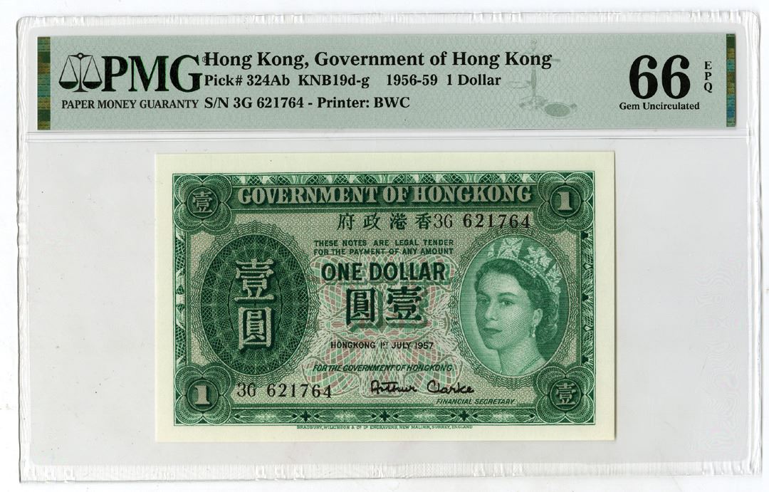 Hong Kong, 1956-59. $1, P-324Ab, KNB19d-g, Issued Banknote, Green on m/c underprint with portrait of Queen Elizabeth II at right, S/N 3G 621764, PMG graded Gem Uncirculated 66 EPQ, Printer: BWC.