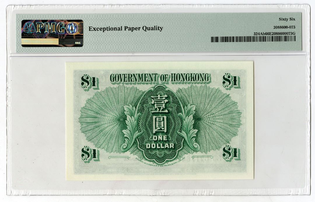 Hong Kong, 1956-59. $1, P-324Ab, KNB19d-g, Issued Banknote, Green on m/c underprint with portrait of Queen Elizabeth II at right, S/N 3G 621764, PMG graded Gem Uncirculated 66 EPQ, Printer: BWC.