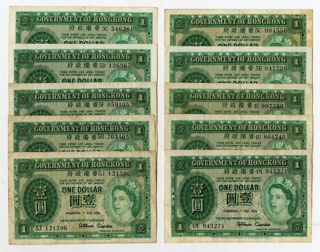 Hong Kong, 1958. $1, P-324Ab (10), Lot of 10 Issued Banknotes, Green on m/c underprint with portrait of Queen Elizabeth II at right, Printer: BWC, Notes are Fine-VF condition. (10). Sold "AS IS" no returns accepted.