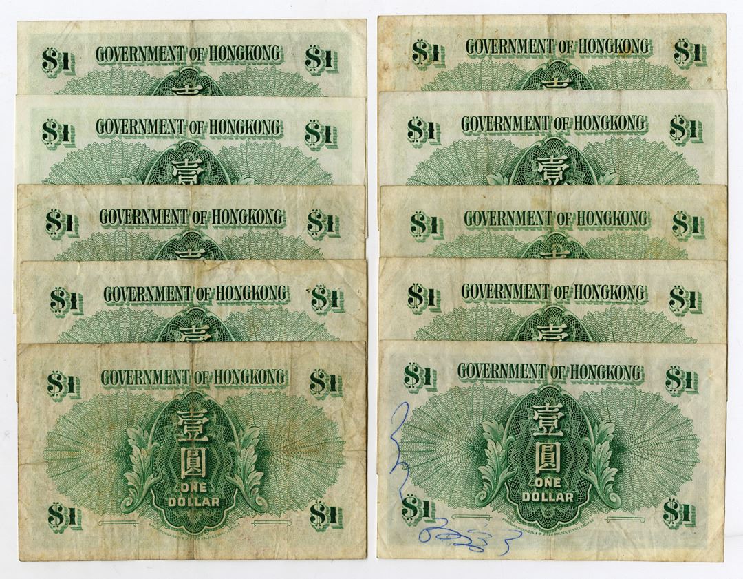 Hong Kong, 1958. $1, P-324Ab (10), Lot of 10 Issued Banknotes, Green on m/c underprint with portrait of Queen Elizabeth II at right, Printer: BWC, Notes are Fine-VF condition. (10). Sold "AS IS" no returns accepted.