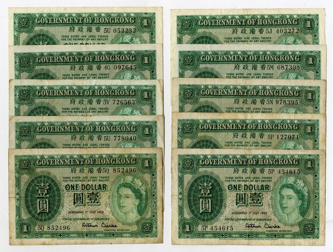 Hong Kong, 1958. $1, P-324Ab (10), Lot of 10 Issued Banknotes, Green on m/c underprint with portrait of Queen Elizabeth II at right, Printer: BWC, Notes are Fine-VF condition. (10). Sold "AS IS" no returns accepted.