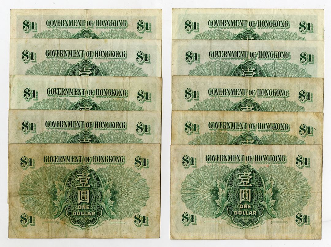 Hong Kong, 1958. $1, P-324Ab (10), Lot of 10 Issued Banknotes, Green on m/c underprint with portrait of Queen Elizabeth II at right, Printer: BWC, Notes are Fine-VF condition. (10). Sold "AS IS" no returns accepted.