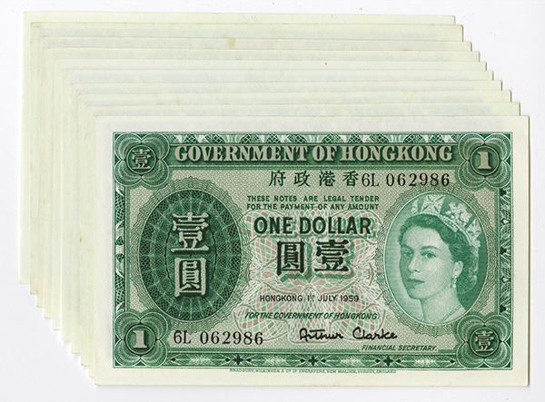 Hong Kong, 1959, Lot of 10 notes, No sequential, All are $1, P-324Ab, issued, condition varies between XF to Choice AU with possibly a couple better. BWC. Sold "As is" No returns accepted.