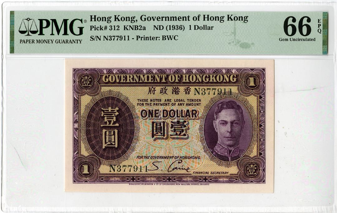 Hong Kong, ND (1936). $1, P-312, KNB2a, Issued Banknote, Purple on m/c underprint with King George VI at right, S/N N377911, Printer: BWC, PMG graded Gem Uncirculated 66 EPQ.