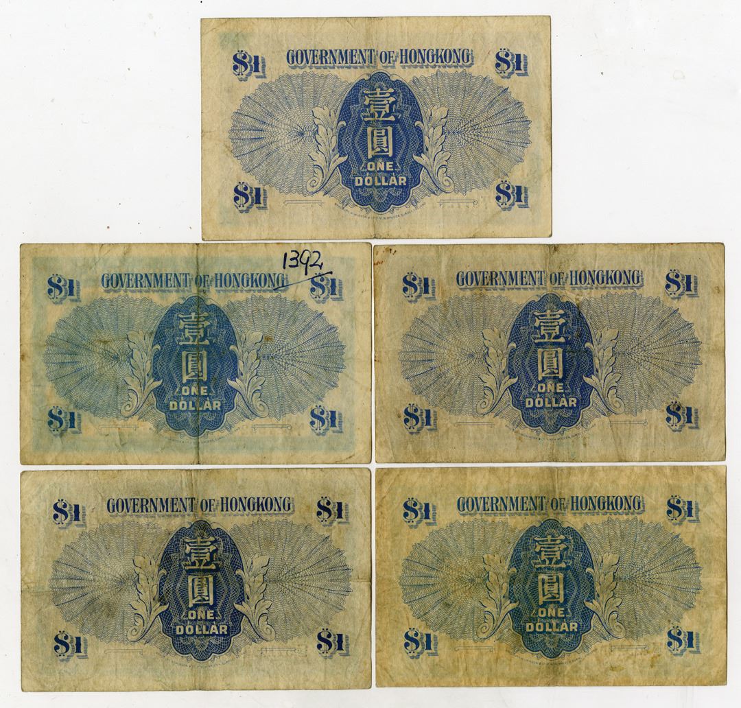 Hong Kong, ND(1940-41). $1, P-316 (5), Lot of 5 Issued Banknotes, Dark blue on m/c underprint with portrait of King George VI at right, Printer: BWC, Notes are Fine-VF condition. (5). Sold "AS IS" no returns accepted.