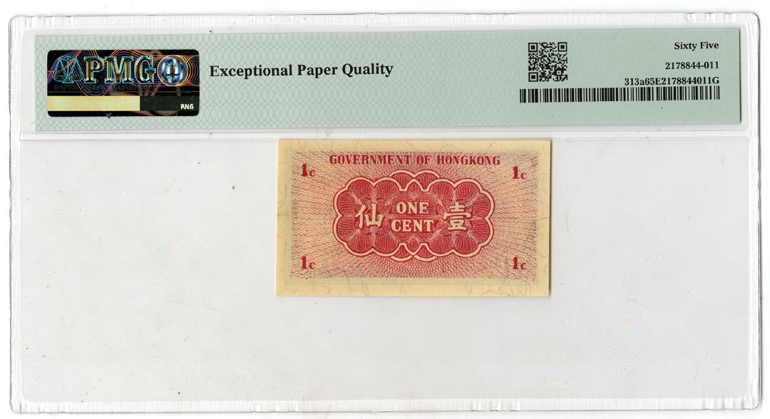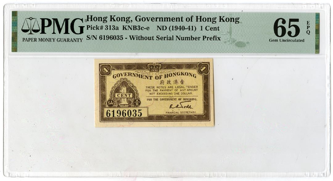 Hong Kong, ND (1940-41). 1 Cent, P-313a, KNB3c-e, Issued Banknote, Brown on yellow underprint with bank title at top and denomination at left, S/N 6196035 - Without number prefix, PMG graded Gem Uncirculated 65 EPQ.