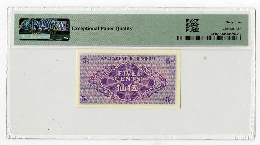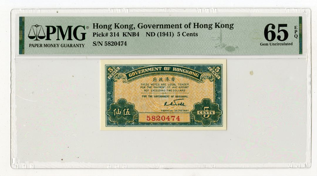 Hong Kong, ND (1941). 5 Cents, P-314 KNB4, Issued Banknote, Green on orange underprint, Back is purple, S/N 5820474, PMG graded Gem Uncirculated 65 EPQ.