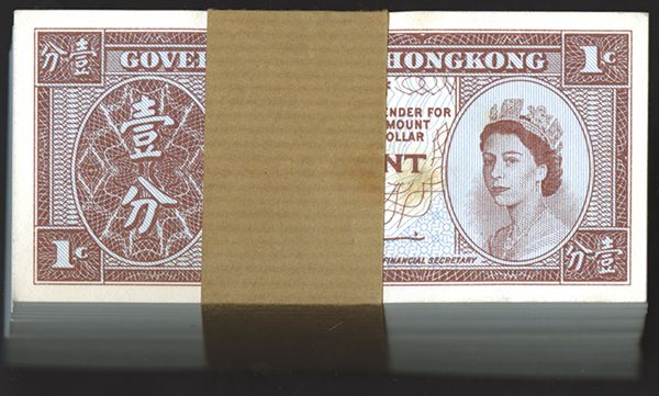 Hong Kong. Elizabeth II Cent P-325a. Signature 1. J.J. Copperthwaite. Banded pack of what must be 500 notes. First note with a stain, others are Choice Uncirculated. Sold as is. NO RETURNS.