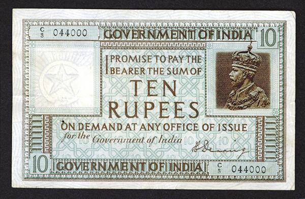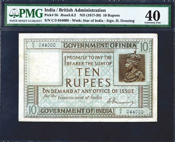 India. 10 Rupees. P-5b. Jhun3.6.2, George V at right. Signature of H. Denning. Bold watermark. S/N C/3 044000, PMG graded Extremely Fine 40. Attractive note.
