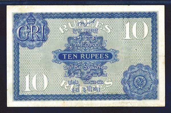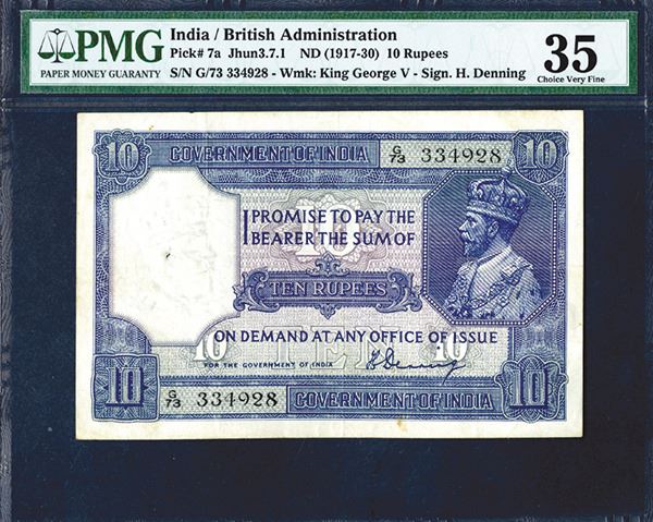 India - British Administration. 10 Rupees. P-7b. George V at right end and as watermark. Taylor Signature. PMG Graded Extremely Fine 40, spindle hole at issue.