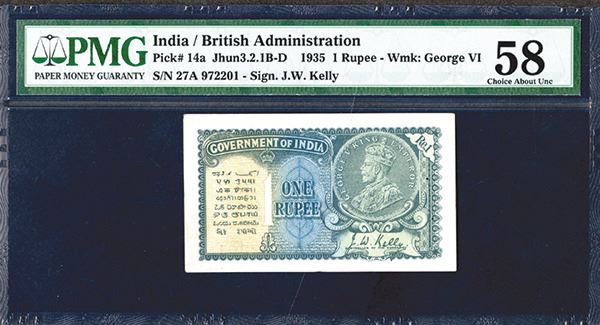 India. 1 Rupee. P-14a. Jhun3.2.1B-D, George V coin at right. Watermark George V portrait at left. S/N 27A 972201, PMG graded Choice About Unc. 58.