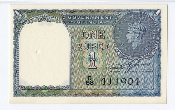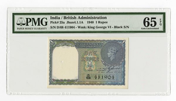 India, 1 Rupee, P-25a, issued banknote, Black S/N, S/N D/68 4J1904, PMG graded Gem Uncirculated 65 EPQ.