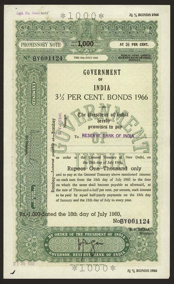 India. 1000 Rupees 3-1/2% Bond. Several interest payment endorsements on back. VF+