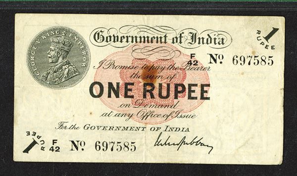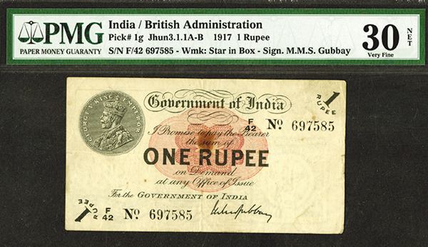 India. 1 Rupee. P-1g. Jhun3.1.1A-B, King George V coin at top left. Watermark star in square. No staple holes. S/N F/42 697585, Signature: M.M.S.Gubbay, PMG graded Very Fine 30 NET with note of foreign substance (stain in middle), otherwise very attractive note for grade..