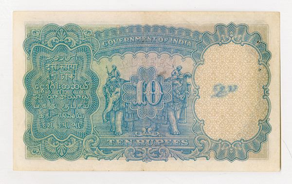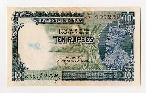 IndiaÉ.10 Rupees, P-16b, Kelly sig., blue, King George V at right, Crisp Choice VF to XF but appears better, usual 2 staple holes at left, S/N P/47 407252, Attractive note for grade.