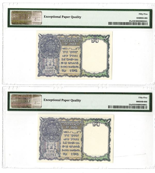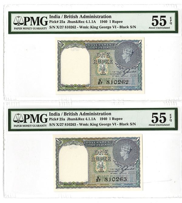 India, ND (1940), Lot of 2 sequential notes. 1 Rupee, P-25a, Jhun1.1A, Issued banknote, King George VI on right, left with George VI Watermark, Black Signature, Signature of C.E. Jones, S/N's X/27 810262-817263, Both are PMG graded About Uncirculated 55EPQ (Exceptional Paper Quality).
