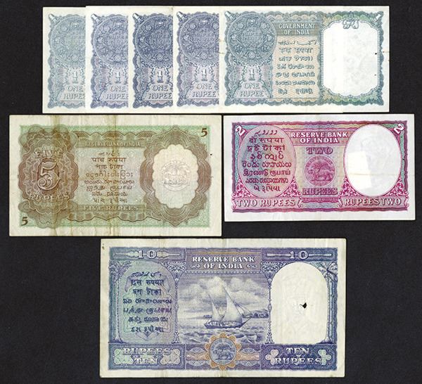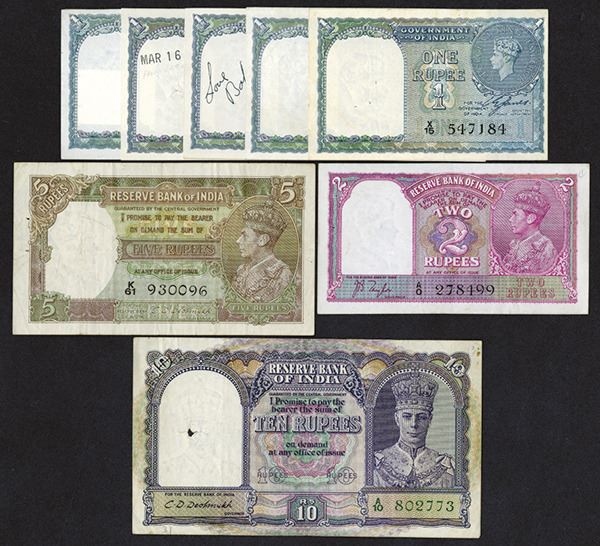 India. 1, 2, 5, 10 Rupees. P-17a; 18b; 24; 25a (4); d. George VI on all. Staple or spindle hole, rust or graffiti on some. Otherwise Very Fine. 8 pieces.