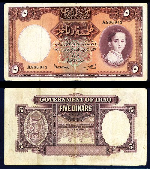 Iraq, 1931 (ND 1942), 5 Dinars, P-19, Issued banknote, S/N A886943, King Faisal II as child, PMG graded Very Fine 25, attractive and original note. BWC.