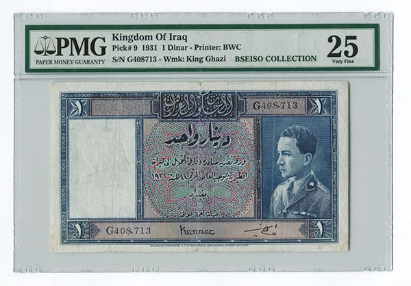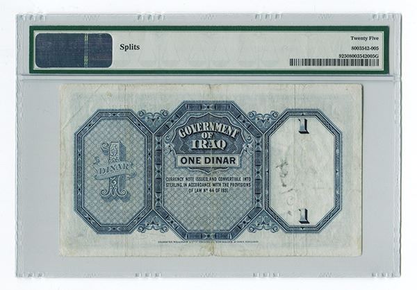 Iraq, 1 Dinar, L. 1931, P-9, signatures of Lord Kennet and Ata Amin. Very scarce type. Graded PMG 25 with remark of "splits". BWC.