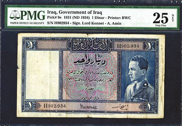 Iraq, 1 Dinar, P-9e, Issued banknote, Blue on m/c, Portrait of King Ghazi in uniform at right, back blue, S/N H902,934, PMG graded Very Fine 25 NET with note stains and a small pin hole, still attractive for issue. BWC. This note was also purchased at the Long Beach show in 1968 and has never seen the light of day since then.