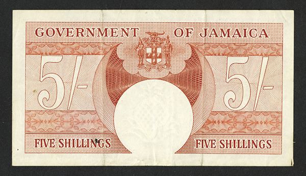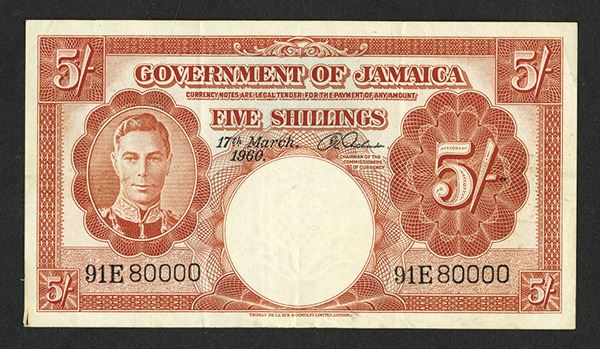Jamaica. 5 Shillings. P-41b. 17.3.1960, last date of the type. George VI at left. VF to XF with a 2mm slice on the lower left margin, Distinctive serial #91E 8000. TDLR.