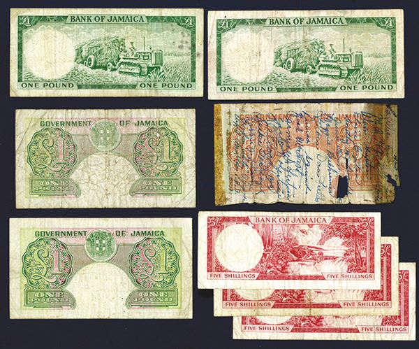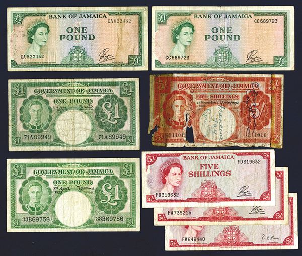 Jamaica. 5 Shillings, 1 Pound. George VI. SCWPM 37 (fragmented, 18+ signature short snorter); 41b (2); 5 Shillings, 1 Pound. Elizabeth II. SCWPM 49 (3); 51 (2). Mostly Very Good-Fine except as noted. 8 pieces.