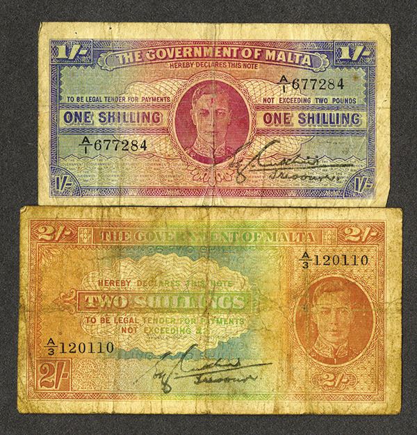 Malta. 1, 2 Shilling. P-16, 17b. George VI on both. First is Very Fine, second Fine. Both with Strong folds. 2 pieces.