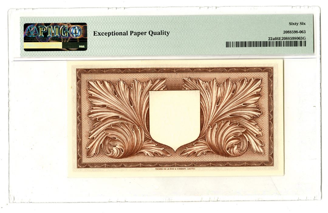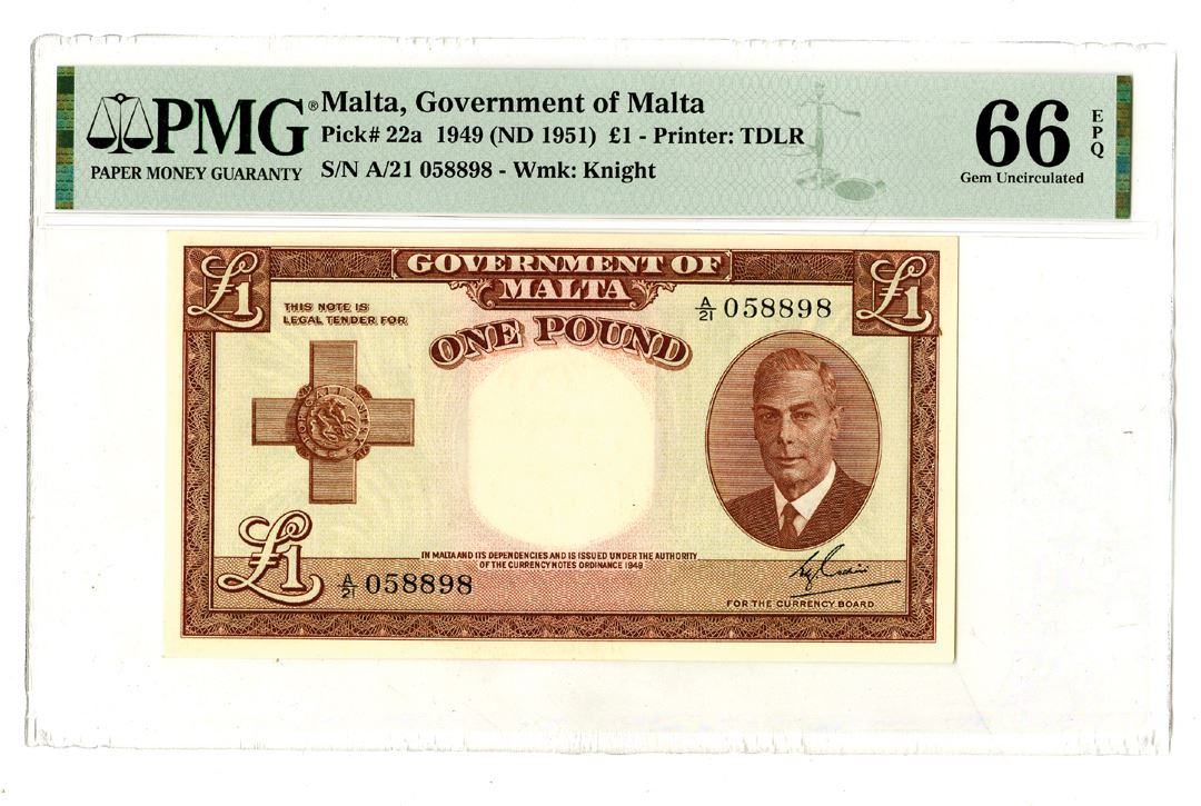 Malta, 1949 (ND 1951). 1 Pound, P-22a, Issued banknote, Brown on multicolor underprint, S/N A/21 058898, Watermark: Knight, PMG graded Gem Uncirculated 66 EPQ. Printer: TDLR.