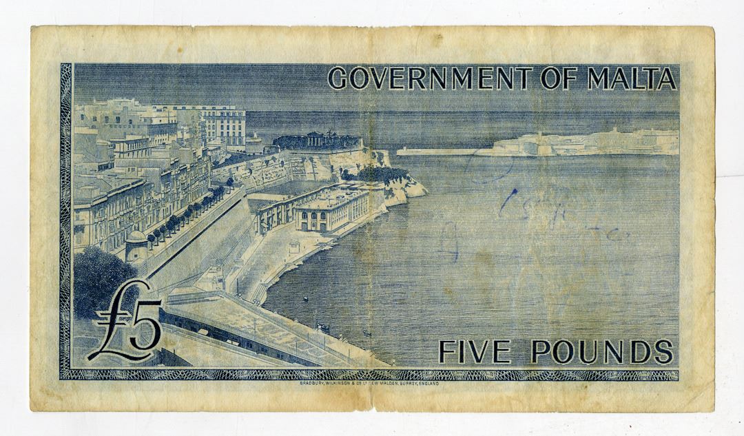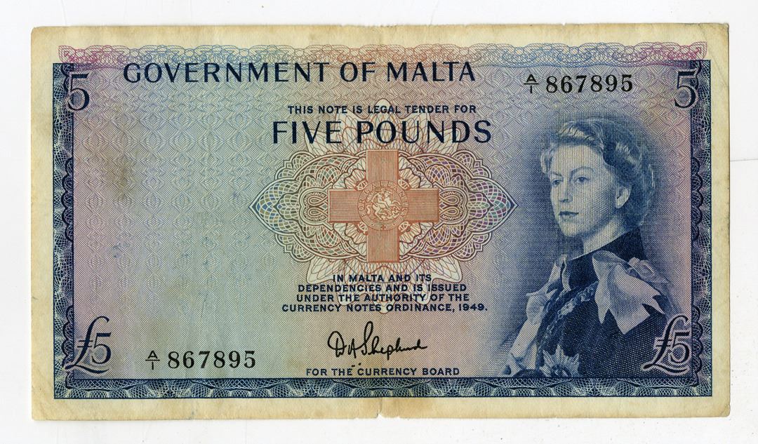 Malta, L.1949 (1961). 5 Pounds, P-27a, Issued Banknote, Blue on m/c underprint, Queen Elizabeth II at right and cross at center, Back is blue with Grand Harbor at center, S/N A/I 867895, Fine-VF condition, BWC.