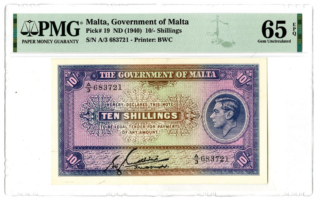 Malta. ND (1940). 10/- Shillings, P-19, Issued banknote, Blue and violet on face, S/N A/3 683721, PMG graded Gem Uncirculated 65 EPQ. Printer: BWC.