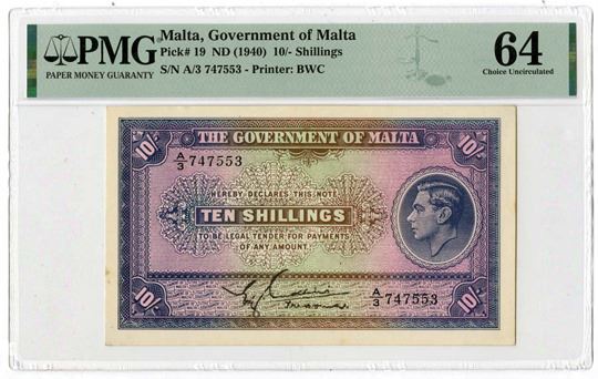 Malta, ND (1940). 10/- Shillings, P-19, Issued Banknote, Blue, violet, and olive underprint with portrait of King George VI at right, Uniface note, S/N A/3 747553, PMG graded Choice Uncirculated 64, Printer: BWC.